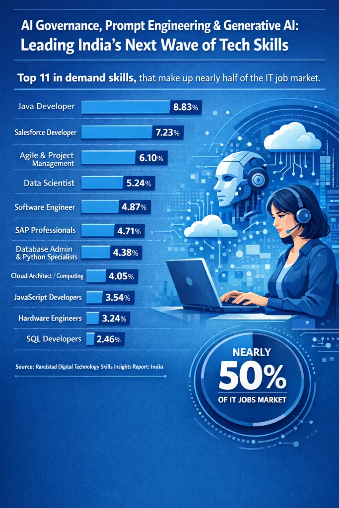 The Report shows that while foundational skills like Java, Salesforce, and Agile still make up nearly one third of IT roles, the workforce is rapidly shifting toward high impact, AI enabled and governance focused functions. Demand for AI and machine learning engineers, data scientists, and AI governance specialists is set to surge in 2026. At the same time, cybersecurity is undergoing a major reset as AI driven threats force enterprises to rebuild security operations, creating new opportunities for forensic analysts, AI security experts, ethical hackers, and incident responders.